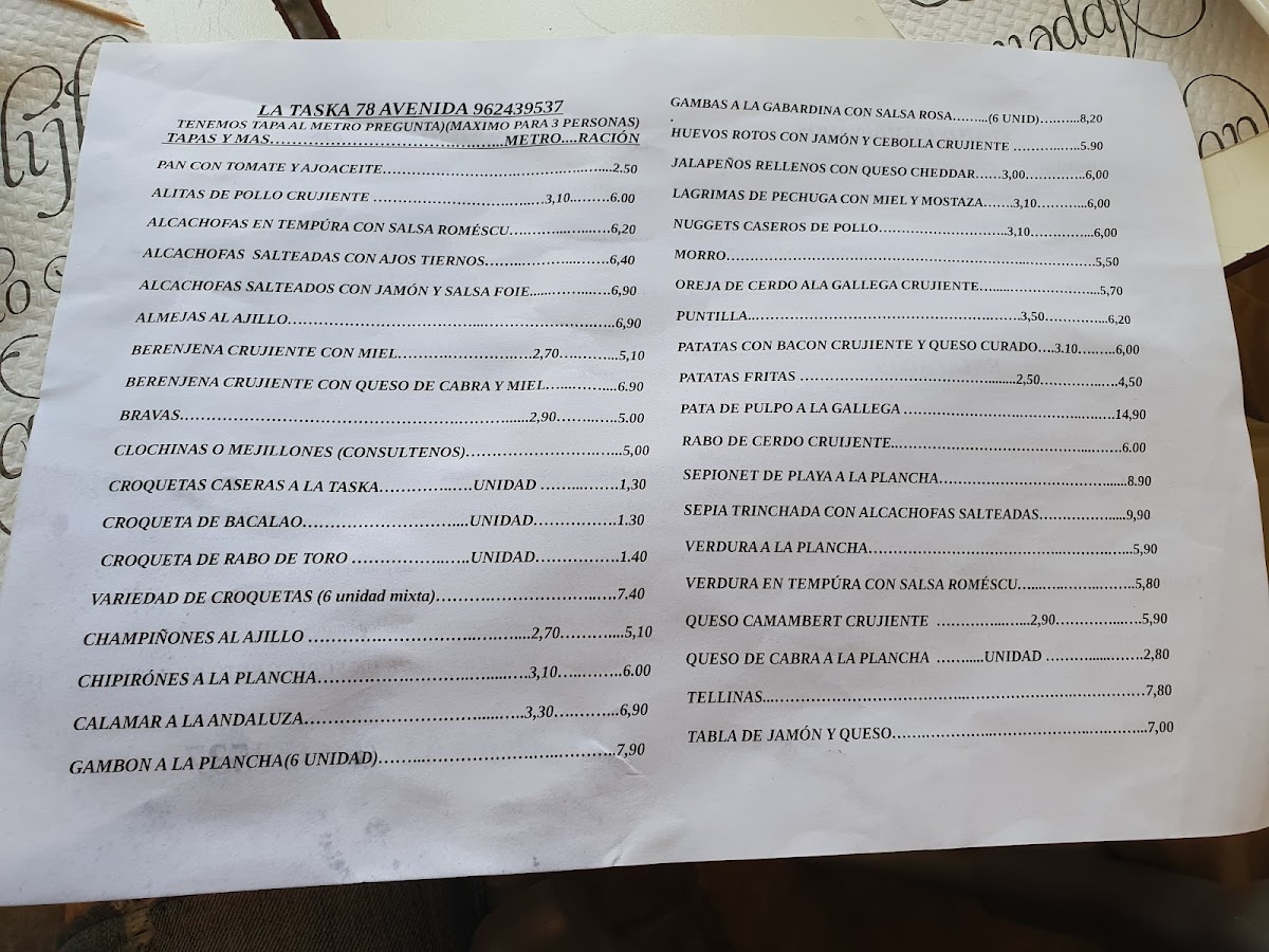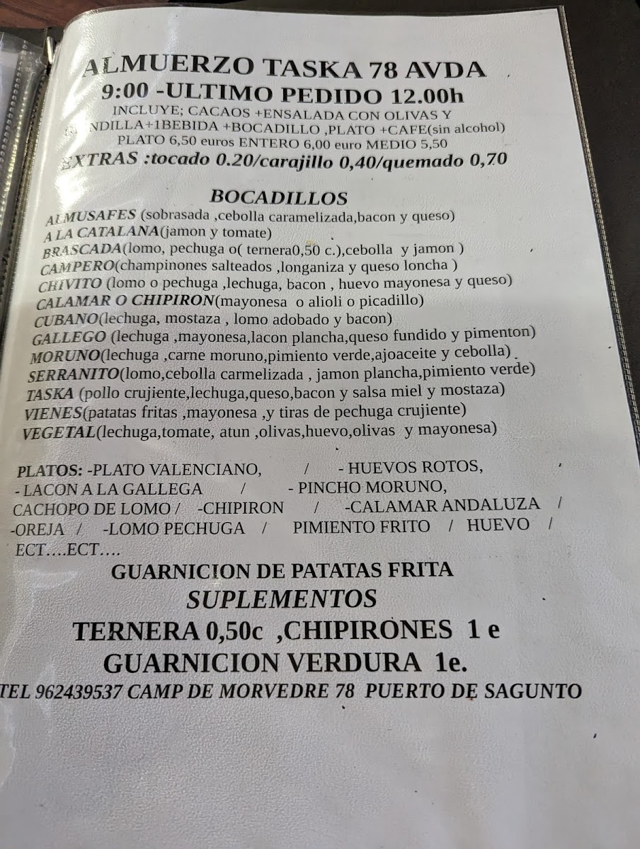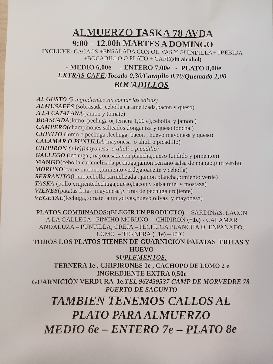 Bar restaurante Taska 78 avda offers a welcoming blend of traditional Spanish bar and grill flavors right in the heart of Port de Sagunt. The menu focuses on simple, homemade dishes that are both hearty and economical, making it a favorite among locals and visitors alike. Highlights include freshly prepared bocadillos paired with olives, nuts, and crisp salads—an ideal almuerzo for just 5€. Their tapas selection features well-executed classics like camembert cheese and the surprisingly tender, flavorful ear of pork. The bar’s grilled vegetables and generous portions of fries, sometimes accompanied by a fried egg, pleasantly surprise guests seeking comfort food with a twist. While meat and fish dishes may not steal the spotlight, the overall quality and generous servings ensure a satisfying meal. The friendly service and cozy terrace spaces enhance the experience, making Taska 78 avda a highly recommendable spot for casual dining and relaxed socializing.
